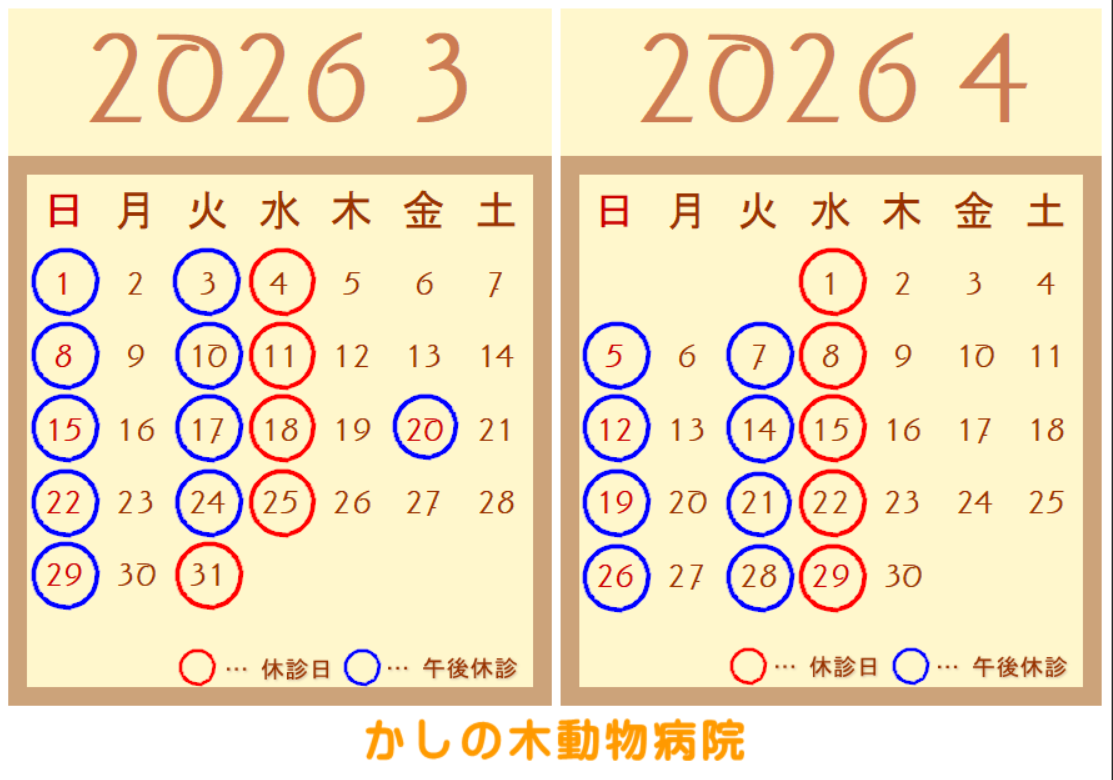 今後ともかしの木動物病院をどうぞよろしくお願い致します。最後にみなさまの健康と動物たちの健康を心よりお祈りいたします。